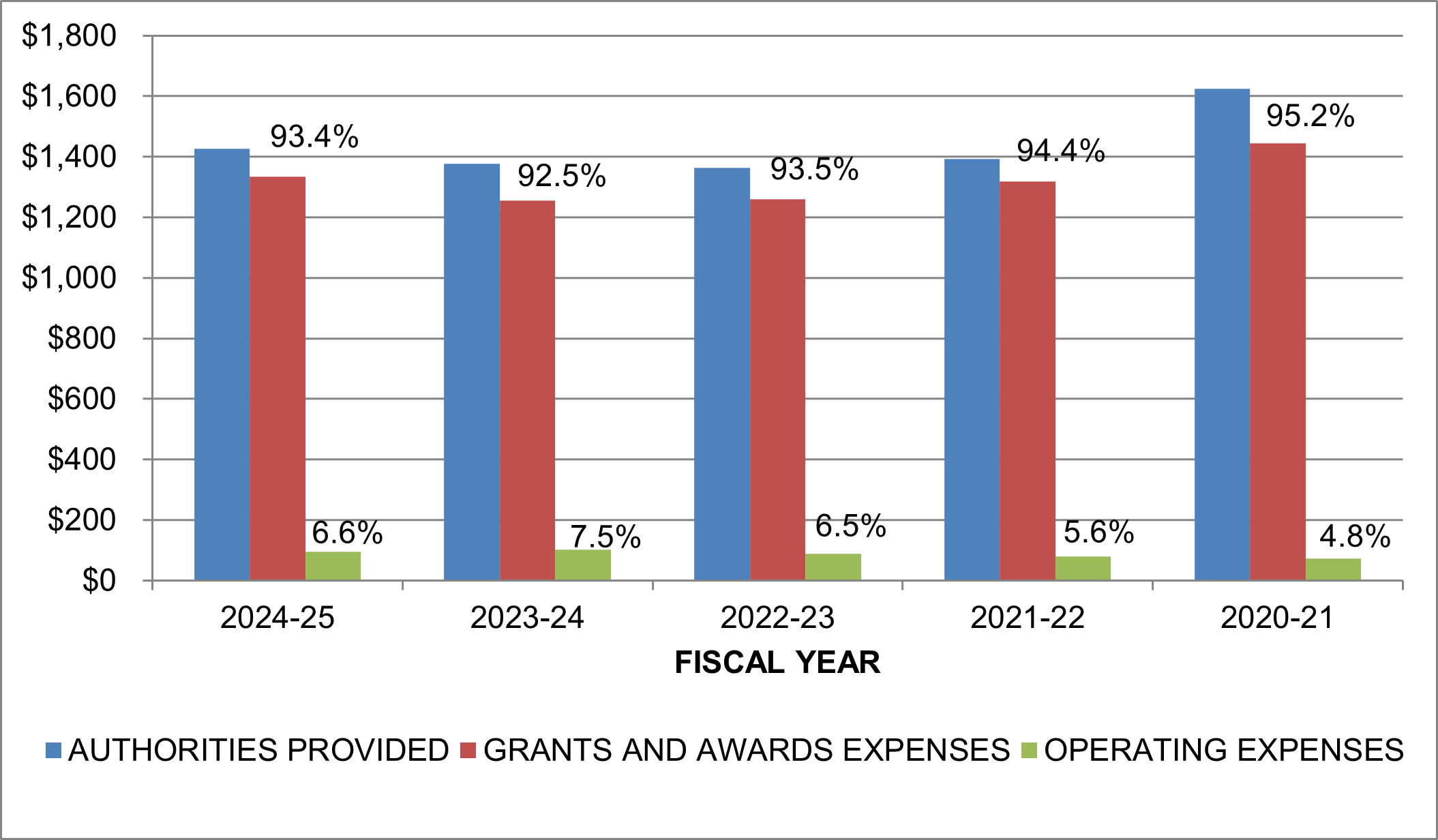 2025 2024 Authorities provided: Vote 1 - Operating expenditures $78,864 $82,970 Vote 5 - Grants 1,336,871 1,283,480 Statutory amounts 9,896 10,183 Less: Frozen authorities (8) (26,566) Authorities available for future years (601) (599) Lapsed: Operating - (450) Lapsed: Grants (649) (561) Current year authorities used $1,424,373 $1,348,457