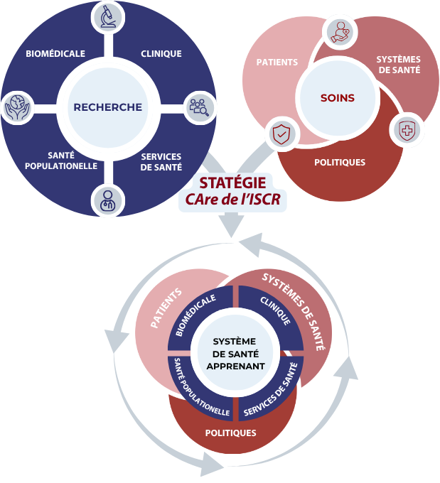 - En haut du diagramme, deux flèches partant des sections Recherche (cercle bleu) et Soins (cercle rouge) se rejoignent en dessous en passant par la case centrale intitulée Stratégie CAre de l'ISCR. La flèche partant de la case centrale descend jusqu'au cercle intitulé Système de santé apprenant. Autour du cercle intitulé Système de santé apprenant, une flèche circulaire fait le tour de l'ensemble de la section.